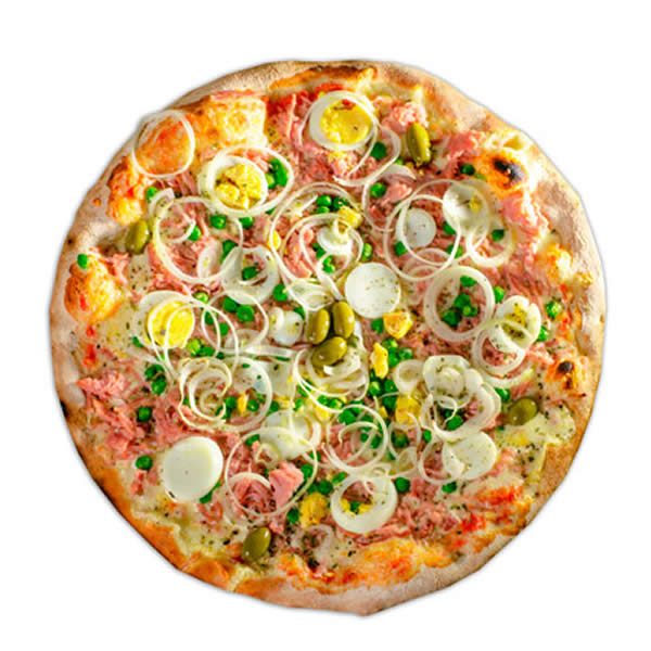 Molho de tomate, queijo mussarela, presunto, tomates, pimentão, ovo cozido, cebola, azeitonas verde e orégano.